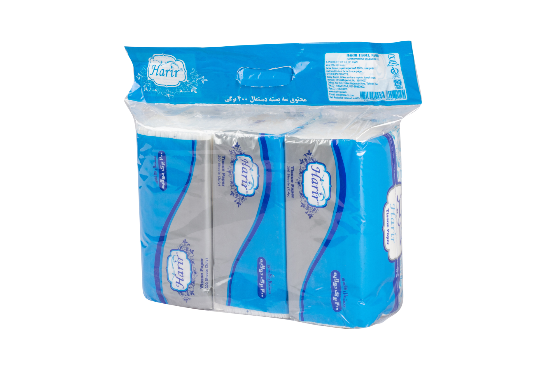 حاوی 3 بسته دستمال 200 برگی (200برگ دولایه) داخل یک کیسه نایلونی (600 برگ دولایه) که به عنوان دستمال 1200 برگی در بازار شناخته شده می باشد.